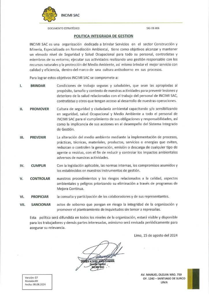 POLÍTICAS SIG POLÍTICAS Sistema Integrado de Gestión POLITICAS SIG-DE-015 POLITICA DE RESPONSABILIDAD SOCIAL.pdf POLITICA INTEGRAL DE DERECHOS HUMANOS, INTEGRIDAD Y DIGNIDAD EN EL TRABAJO.pdf SGI-PO-026